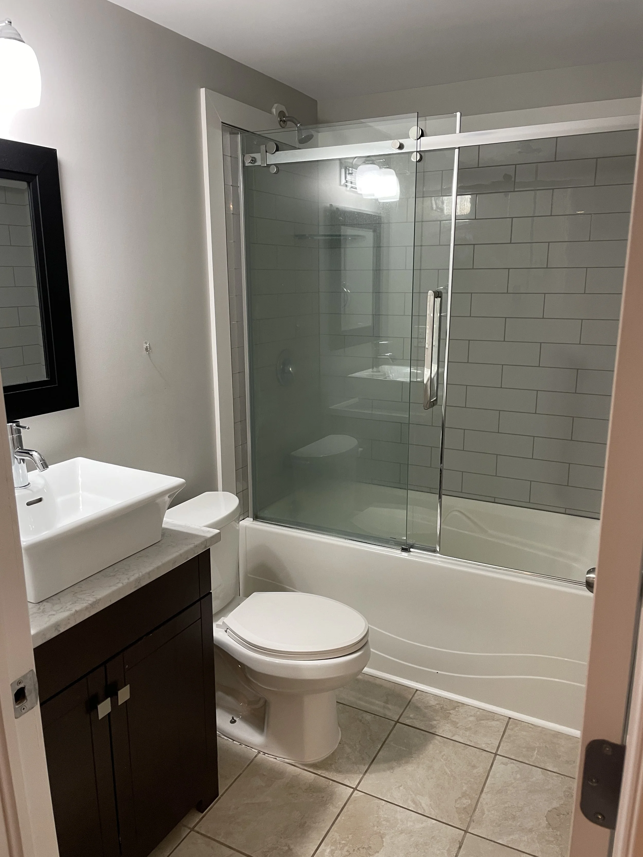 The bathroom has a vanity and a combo bath tub and shower unit.